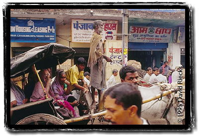 A family in bullock cart watches as they wait for a traffic jam to subside on Cantonment road in Varanasi, Uttar Pradesh