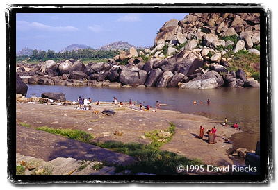 Local inhabitants washing clothes and bathing by Kodandarama temple, Hampi, Karnataka