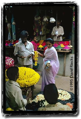 A woman haggles over the price of a garland of flowers in the Devaraj fruit & vegetable market, Mysore, Karnataka.
