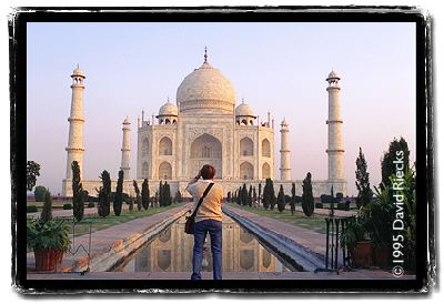 The Taj Mahal, the mausoleum built by Shah Jahan for his wife Arjumand Banu Bagam, would be better reflected in the pool if this tourist hadn't stepped in front of me.